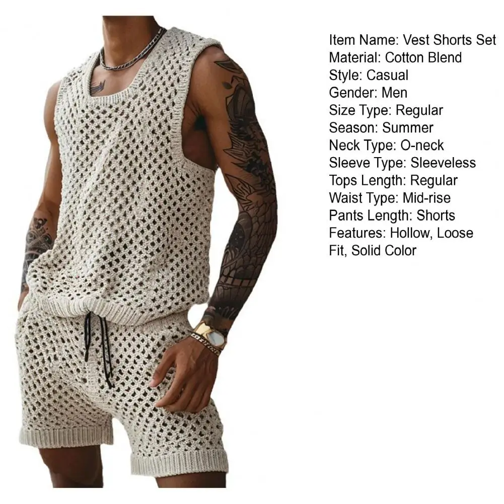 Men's casual two-piece suit with single-breasted short-sleeved shirt and elasticated shorts.